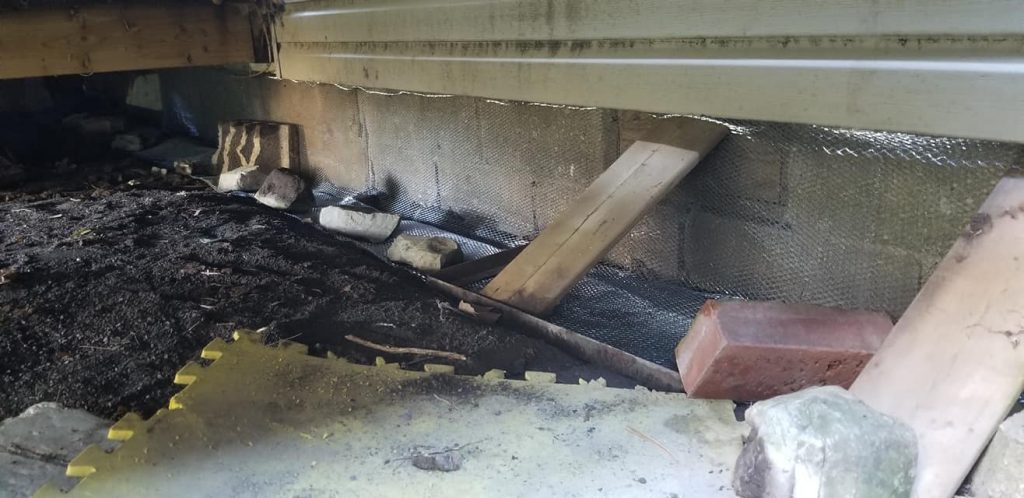 Edit…. Two years later, it’s working. Not perfectly, there are still the odd small mouse in the crawl space, but we haven’t had any big animals and no rodents in the house that I’ve found. The mesh is holding up well and I only have had to reattach it in a few place. For what it cost (around $400) a rousing success.